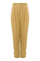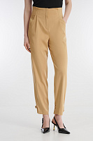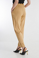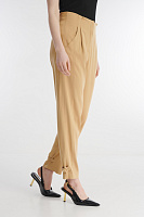 Стильные зауженные брюки полной длины выглядят нарядно и эффектно благодаря продуманному крою и деталям. Брюки без пояса обладают комфортной посадкой за счет широкой резинки сзади. Зауженные брючины на щиколотке дополнены хлястиками, которые позволяют регулировать ширину. Этот прием не только визуально стройнит ноги, но и в целом делает образ более выразительным. Отделка декоративной строчкой в тон ткани подчеркивает элегантность модели.