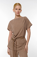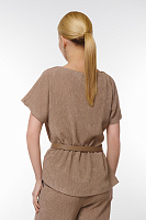 Блузка с драпировкой выполнена из высококачественного текстиля, что обеспечивает как комфорт, так и шикарный внешний вид. Элегантный пояс с металлической пряжкой подчеркивает талию, создавая утонченный силуэт. Свободный крой и короткие рукава делают её идеальным выбором как для офисных, так и для повседневных комплектов.