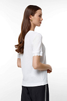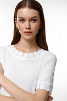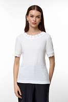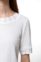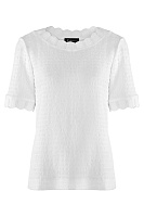 Белая блузка — идеальный выбор для теплых дней. Изготовленная из легкой ткани с рифленой текстурой, она дарит комфорт и свободу движения. Оригинальный круглый вырез с рифленой отделкой добавляет нотку изысканности.