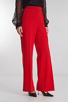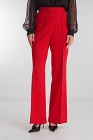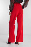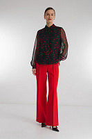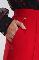Для создания изделия был выбран плотный костюмный материал из смесовой вискозы. Классический дизайн разбавлен декором из небольших заклепок в форме звезд. Простроченные стрелки визуально вытягивают силуэт. Для идеальной посадки изделие дополнили резинкой на поясе.
