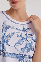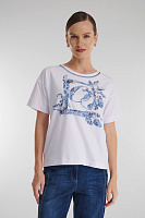Футболка из смесового хлопка. Спущенная линия плеча подчеркивает мягкость силуэта. Акцентные детали — эксклюзивный принт с цветочным дизайном и контрастная декоративная строчка, украшающая вырез.