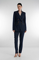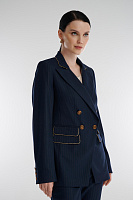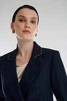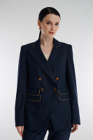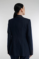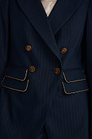 Двубортный пиджак в полоску с люрексом объединяет классику и современный стиль, превращая привычные образы в эффектные. Полуприталенный крой и четкая плечевая линия формируют элегантный силуэт, а золотистая окантовка и акцентные пуговицы добавляют модели изысканность. В паре с брюками из той же линии пиджак создаст выразительный образ для деловых встреч или светских мероприятий.