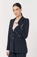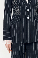 Пиджак в полоску выполнен с цветочной контрастной вышивкой. Благодаря приталенному крою модель выигрышно подчеркивает линию талии и создает элегантный и женственный образ. Дополнить тотал-лук можно с брюками из этой же линии.
