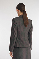 Двубортный пиджак визуально моделирует фигуру, делая похожей на «песочные часы». Крой и вставки с декоративной строчкой акцентируют внимание на талии, а вертикальная полоска вытягивает силуэт. Для создания изделия был выбран высококачественный костюмный материал на основе вискозы, дополненный гладкой подкладкой для еще большего комфорта.