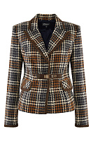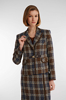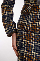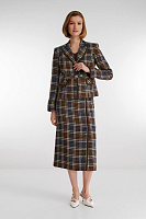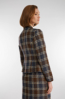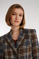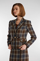 Для создания жакета был выбран приятный фактурный материал на основе вискозы. Сочетание классической клетки и принта пье-де-пуль задает динамичный характер модели. В пару к жакету можно подобрать юбку из той же линейки для создания готового комплекта.