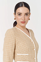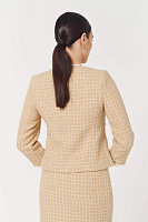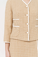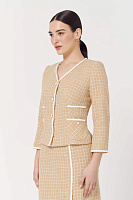 Жакет с контрастной окантовкой и рукавом 3/4 станет отличным дополнением для офисного стиля. Благодаря вкрапленной в материал нити люрекса, жакет имеет ненавязчивый блеск. Составьте полный тотал-лук с жакетом и юбкой из этой же линейки.
