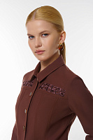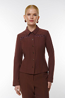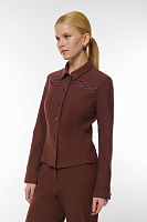 Укороченный жакет с отложным воротником и перламутровыми пуговицами будет отлично дополнять повседневный образ. Вышивка с перфорацией делает акцент и придает изюминку образу.